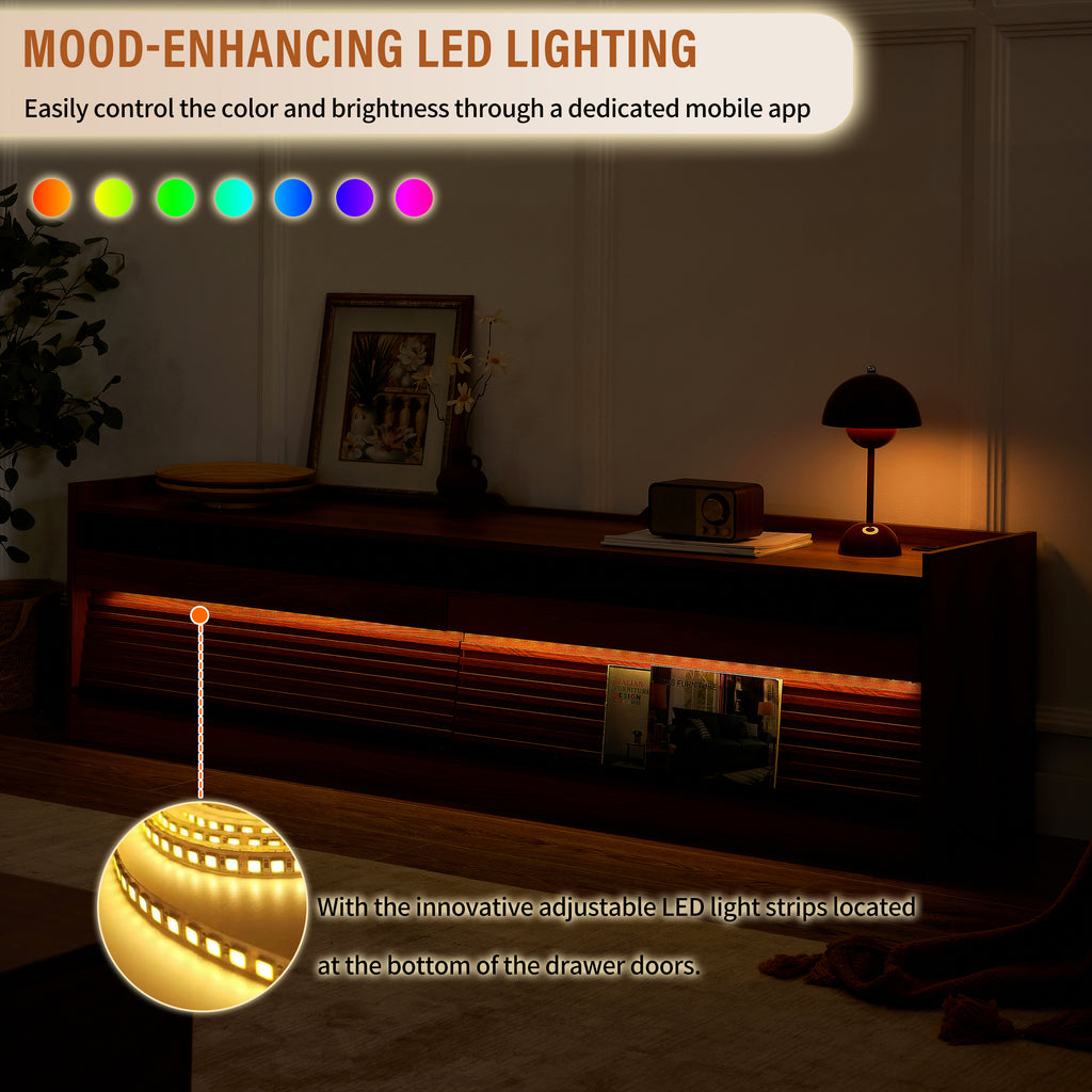 This modern TV stand seamlessly combines style and functionality, offering a sleek, minimalist design that complements a variety of interior styles, from contemporary to traditional. Featuring four spacious drawers with tempered glass fronts and a horizontal stripe design, it adds an elegant touch to your living room while maintaining a clean and sophisticated aesthetic. The integrated charging ports, including Type-C and USB options along with standard outlets, allow you to easily charge your devices while enjoying your favorite shows or movies. Enhancing the ambiance, the built-in LED light strip creates a cozy, cinematic atmosphere, perfect for movie nights or relaxing evenings at home. Additionally, the top surface of the drawers provides convenient storage for magazines and books, keeping your favorite reads within reach and contributing to the overall decor. Overall, this modern TV stand offers a perfect blend of style, functionality, and convenience, making it an ideal addition to your living room or entertainment space.