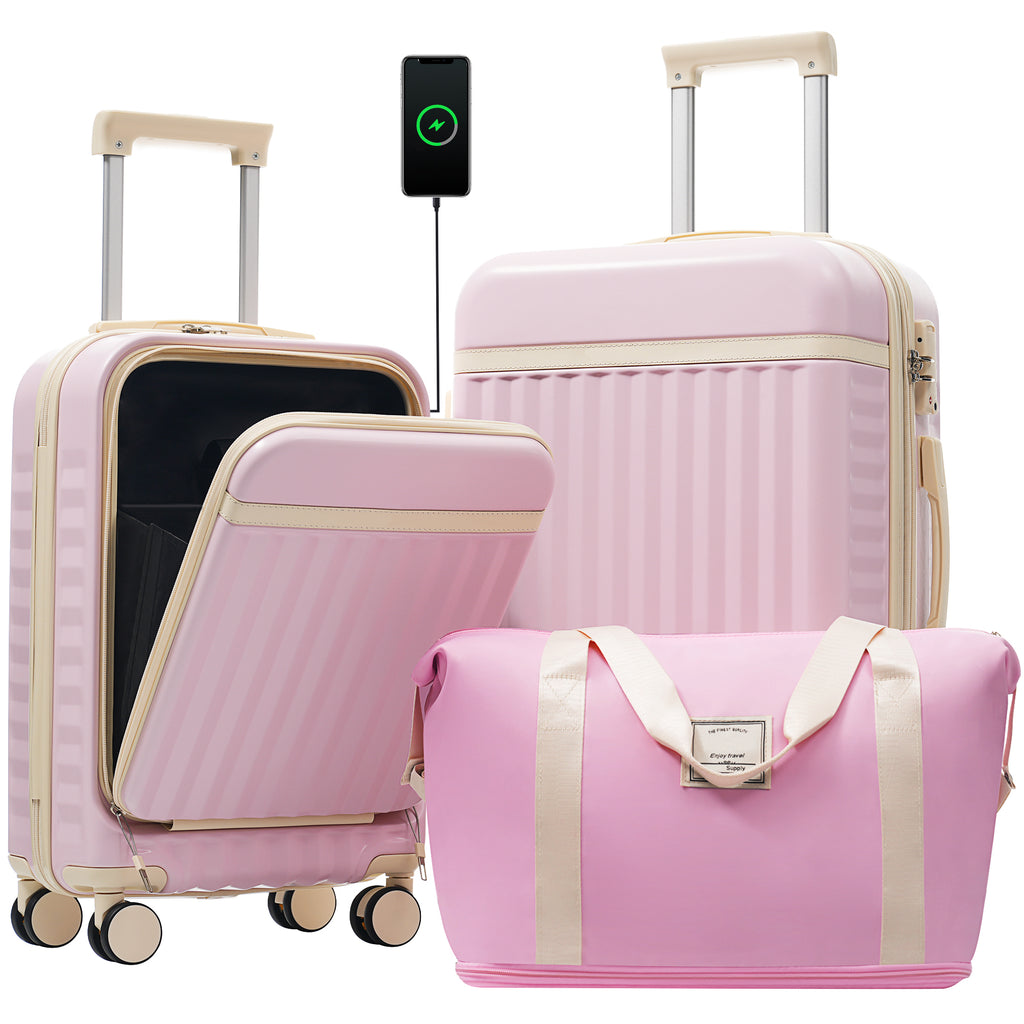 Upgrade your travel experience with the ModernLuxe 3-Piece Luggage Set. Crafted from durable ABS (20'' & 24'' suitcases) and quality fabric (matching duffel), this set combines style and functionality. The 20'' carry-on features a front - opening design for easy access to devices, plus a built-in USB port (power not included). The 24'' suitcase expands for extra packing space, ideal for longer trips. Equipped with explosion - proof zippers, TSA-approved locks, and 360° spinner wheels, it ensures security, convenience, and smooth travel. Perfect for any journey—short or long!