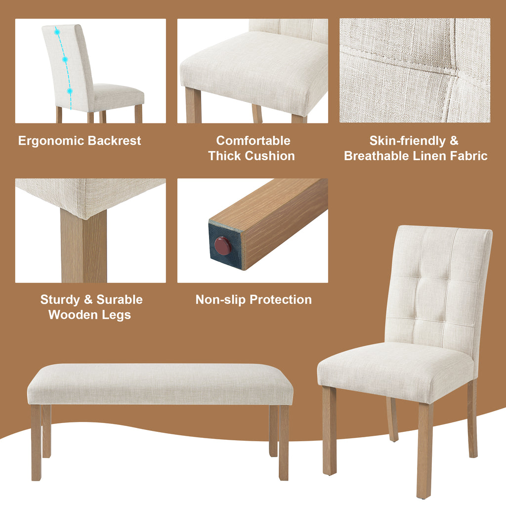 - 6 Pieces Dining Set: The 6 pieces set include 1 rectangular wooden dining table, 4 delicate upholstered chairs and a multi-scene use bench, the overall design is simple and modern. This set of dining table and chairs can not only be used as a dining table, but also can be used as a breakfast bar, coffee bar, workbench and so on, to meet your various needs