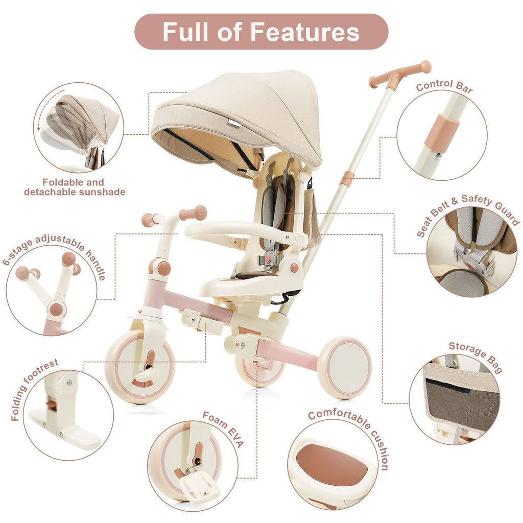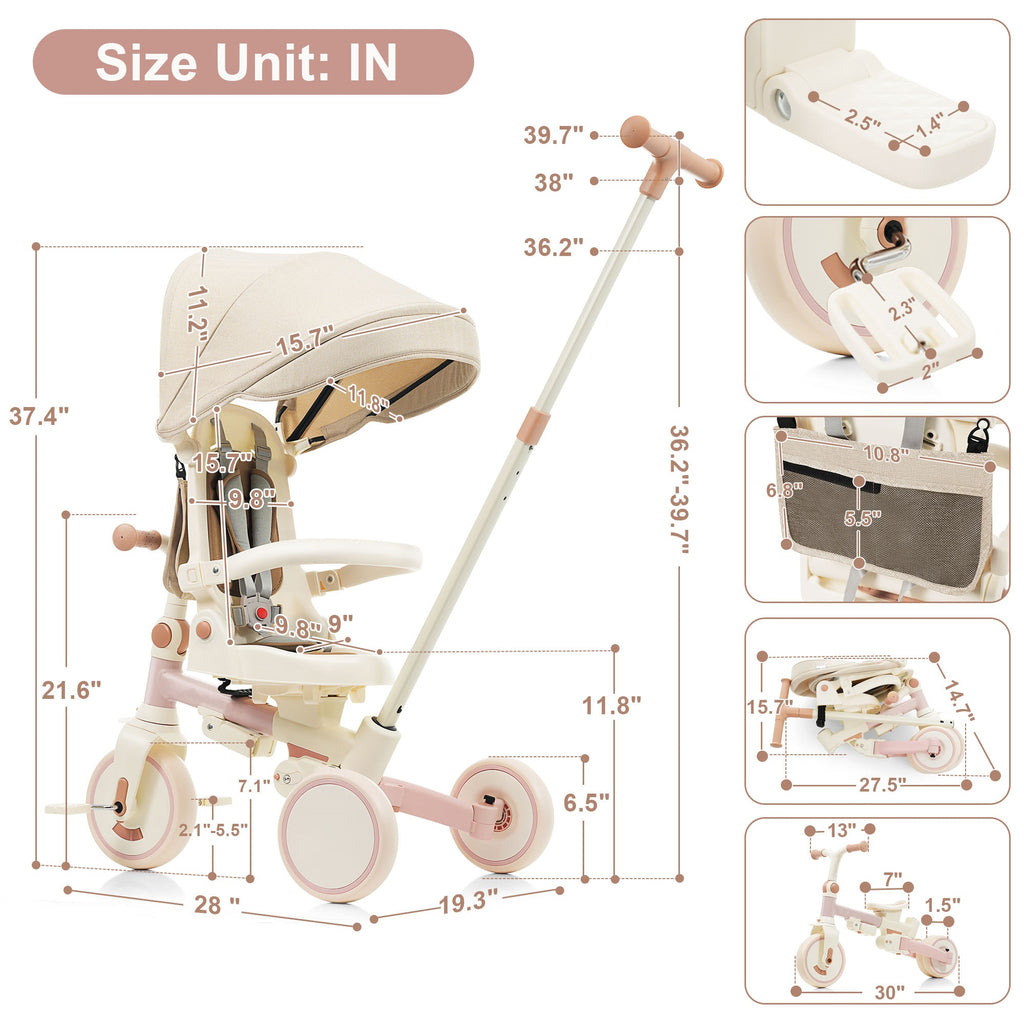 • 7-in-1 Multifunctional-This baby tricycle can be used as a learn-to-ride trike with a canopy, a push tricycle, a standard tricycle, and a balance bike, which meets the needs of children at different stages of growth from 1 to 6 years old.