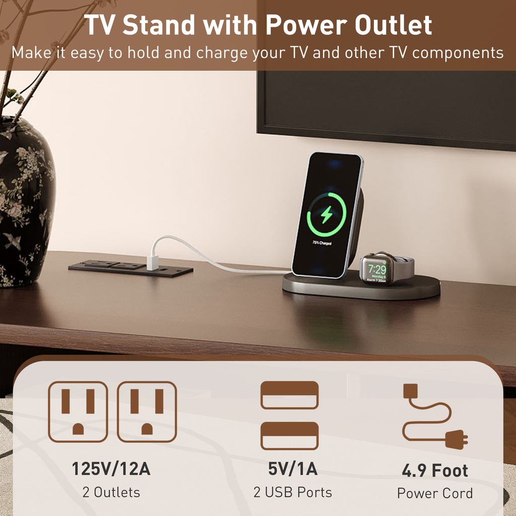 - [Integrated Power Outlet System] Say goodbye to tangled wires and awkwardly placed power strips. This TV stand comes equipped with a built-in power outlet panel, making it incredibly easy to manage and charge your TV and other components. The unit includes two standard outlets (125V/12A) and two USB ports (5V/1A), providing convenient power for all your devices. A 4.9-foot power cord offers flexibility in positioning the stand relative to your wall outlet.