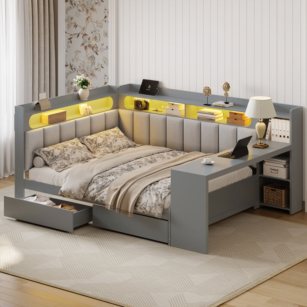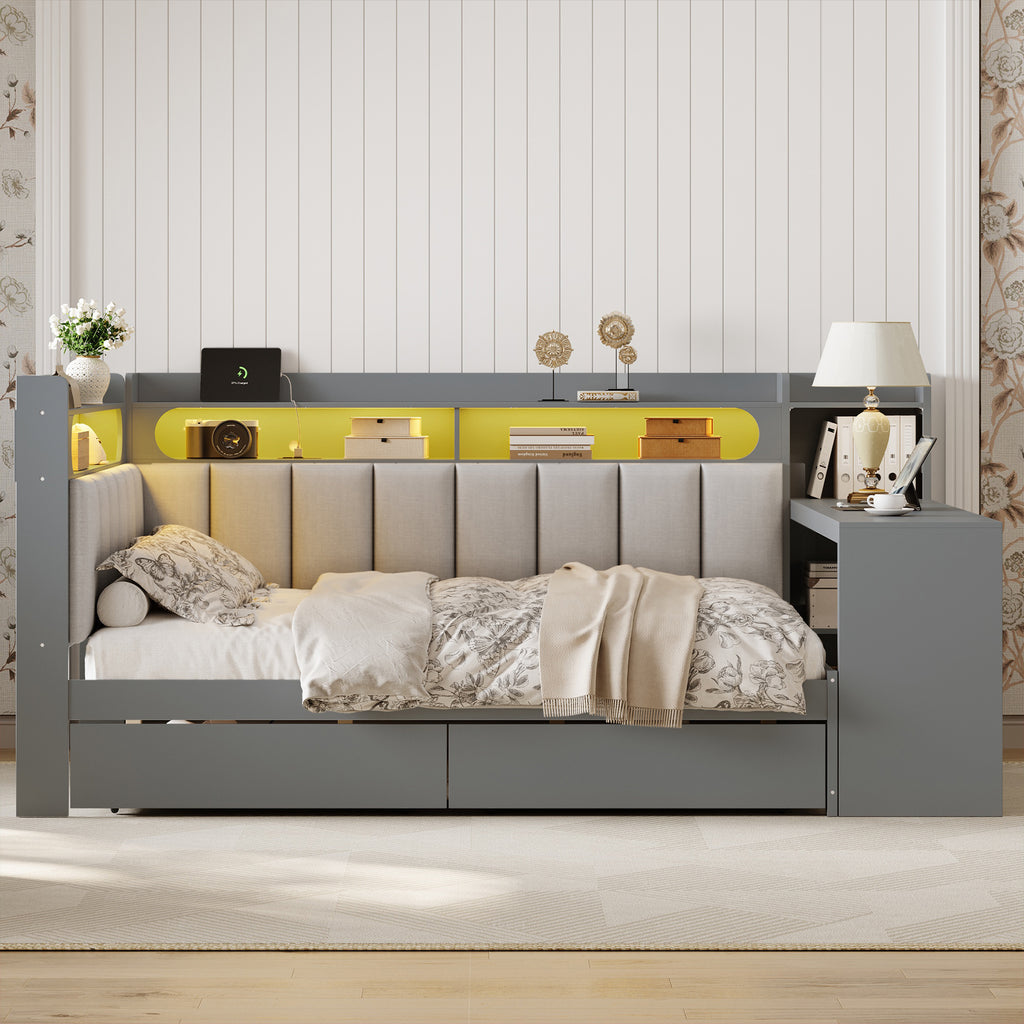 - [LED Light and Charging Station] The Light strip will illuminate activity around your bed or add a sense of ambiance to your room.This daybed comes with 2 standard plug putlets & 2 USB ports in the storage shelf. It is very convenient for you to use your laptop to work immediately or to charge electronic devices while lying down.