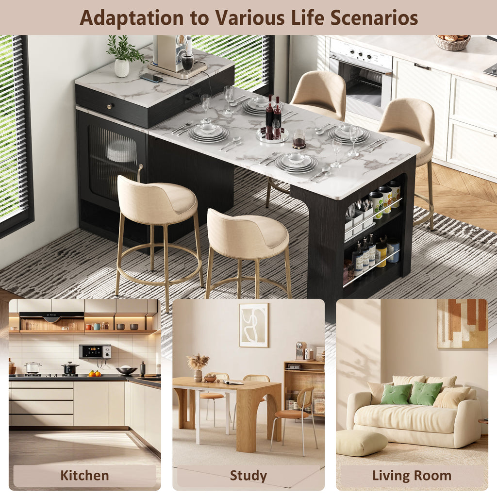 - [Double-sided Storage Design] This kitchen island features an innovative double-sided storage design that maximizes limited kitchen space. Each side features a drawer, with one side housing a cabinet with an adjustable shelf and a glass door, while the other side offers open shelving. Whether faces left or right, the island provides ample usable space from every angle. It also includes a convenient two-tiered side storage area on the extended dining table, making it easy to access condiments and