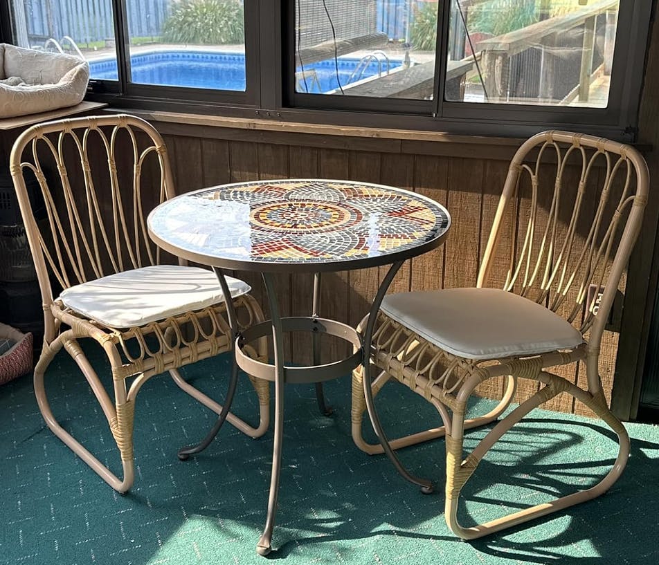 This outdoor chair features a durable iron frame and elegant hand-woven rattan, designed to withstand the elements. With a weight capacity of 400lbs, it provides sturdy, comfortable seating for all. The unique petal-shaped backrest adds a stylish touch, while adjustable foot pads allow for height customization on uneven surfaces. The 1.2-inch thick cushions offer extra comfort and are covered in washable polyester fabric with a zipper for easy cleaning. Available in two colors, this chair comes fully assembled and requires minimal maintenance. Simply wipe with a cloth to keep it looking fresh, making it perfect for any outdoor space.