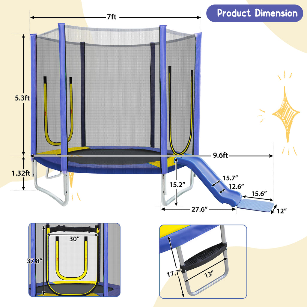 - [Popular 7FT Trampoline] 7' x 6.6' (without slide) Frame to floor height: 15.8'' Slide Size: 27.6''(L) x 15.2''(H) x 15.7''(W) Free Cushion Size: 15.6'' x 12'' Includes all necessary tools and hardware for easy and fast assembly.