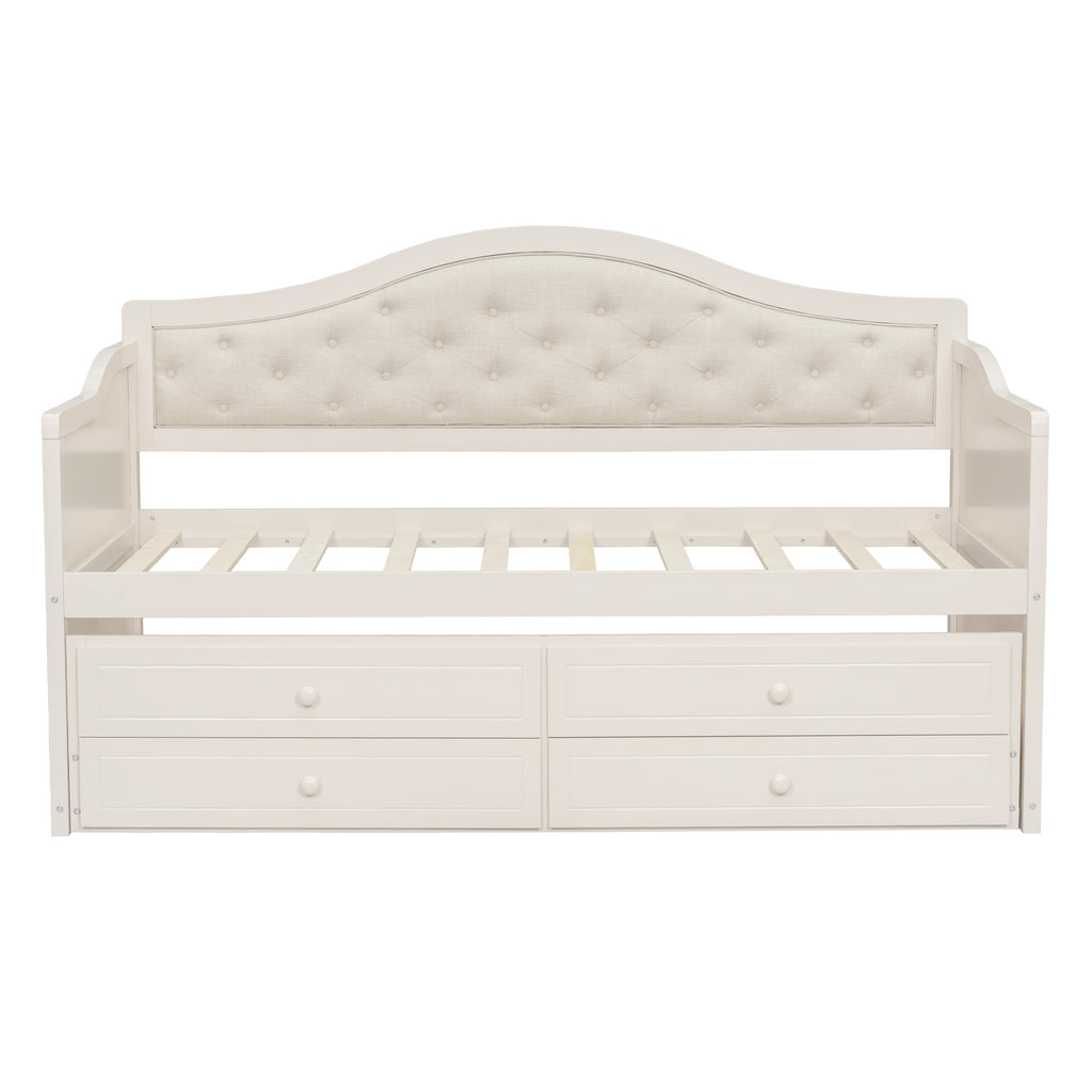 - 3.Upholstered Button-Tufted Backrest: This twin daybed comes with a upholstered button-tufted backrest that combines softness with timeless elegance. The classic tufted design not only enhances comfort but also adds a sophisticated touch, elevating the aesthetic of any room. It's the perfect addition to bring both style and relaxation to your space.