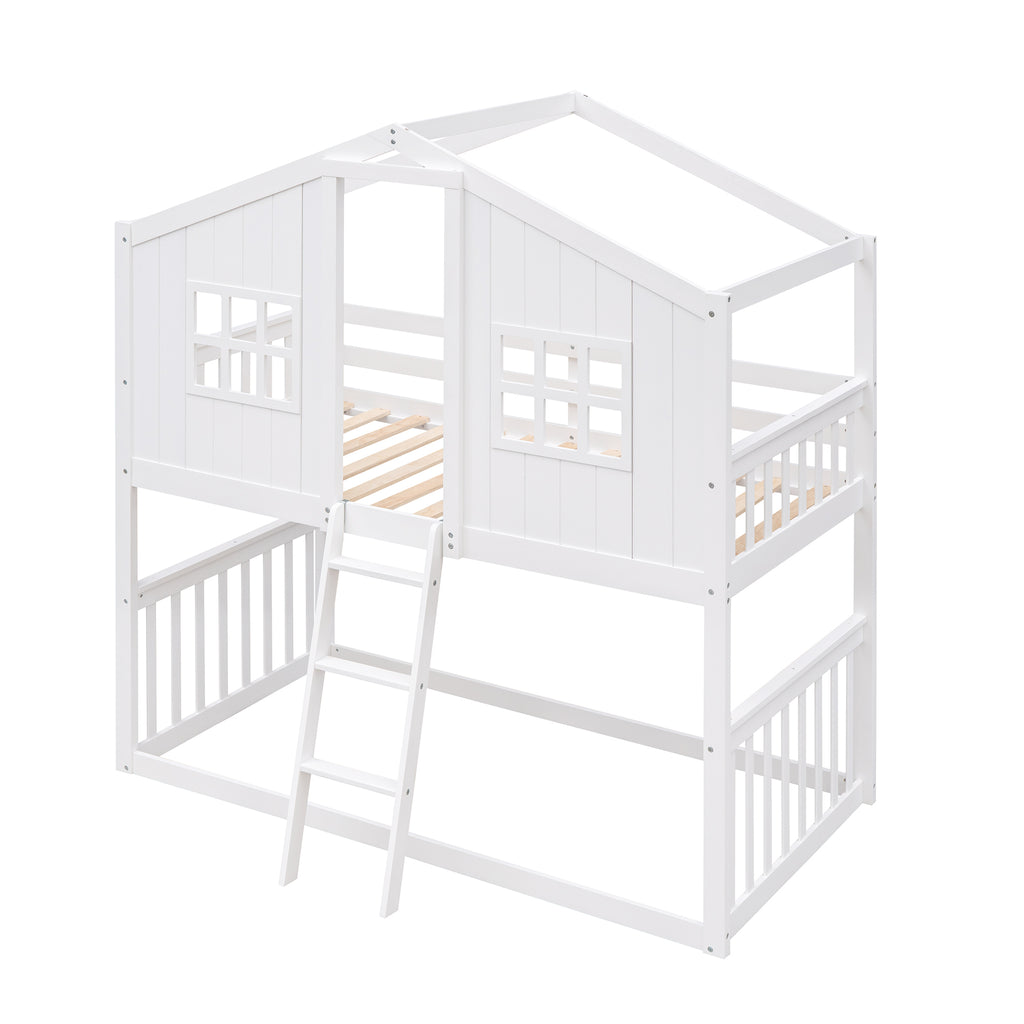 - [House Shaped] Featuring a pitched roof and wall section with window, this unique and intricately designed bunk bed creates a fun and adorable space that not only serves as a comfortable sleeping area but also double as a space for you to play and have fun.