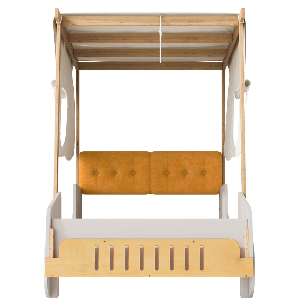 Featuring an attractive car design and a solid wood frame, this bed will be a real eye-catcher in your bedroom. This bed is very comfortable, functional and cool looking at the same time. There are two LED lights at the end of the bed, which are both car lights and night lights for your convenience. The fabric at the top of the bed can spark your child's imagination, and you can decorate the bed with your child.